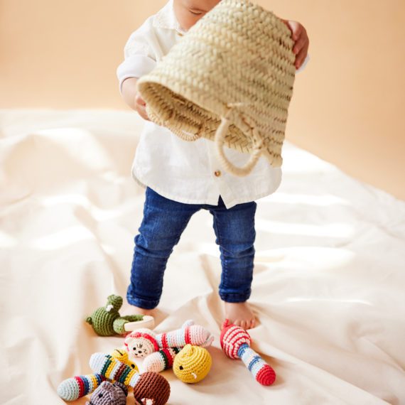 Handgemaakte gehaakte dieren rammelaars van Global Affairs. Superleuk voor jouw kleintje of om cadeau te geven!