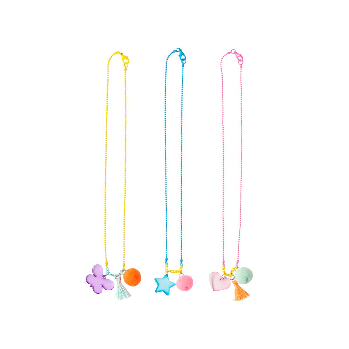 Deze vrolijke ketting van Global Affairs met leuke bedeltjes, is er in drie varianten. Geel, blauw en roze.